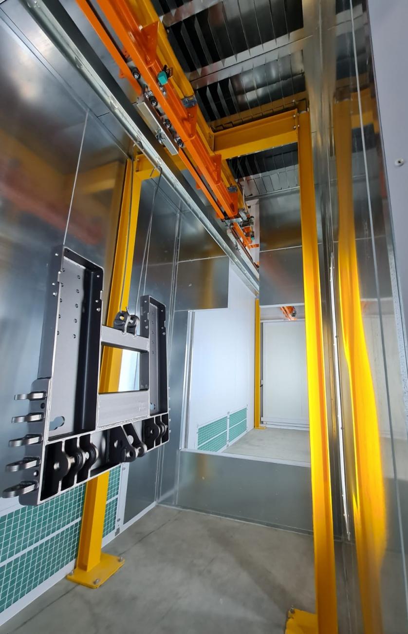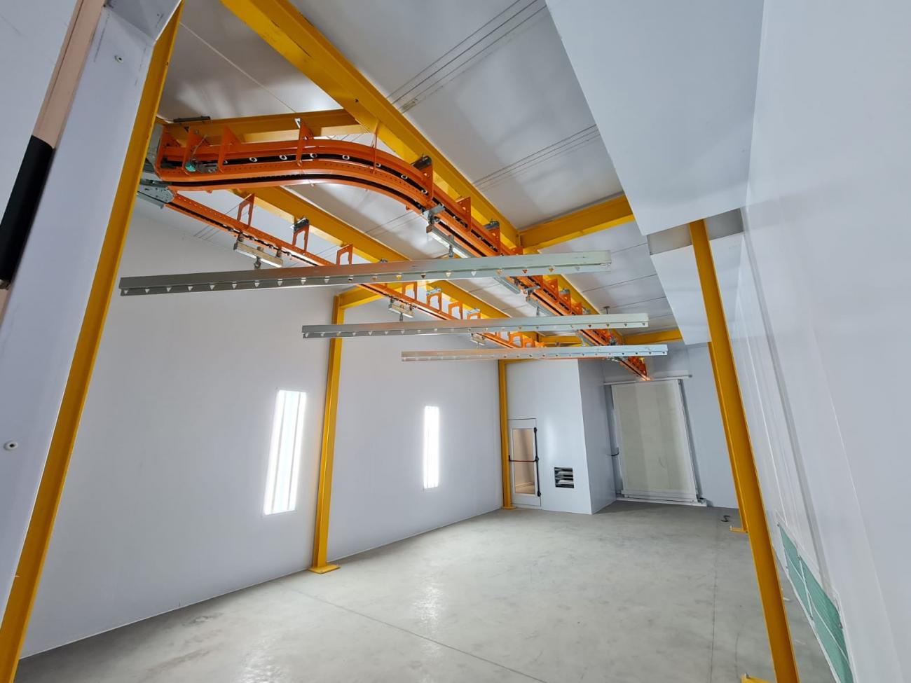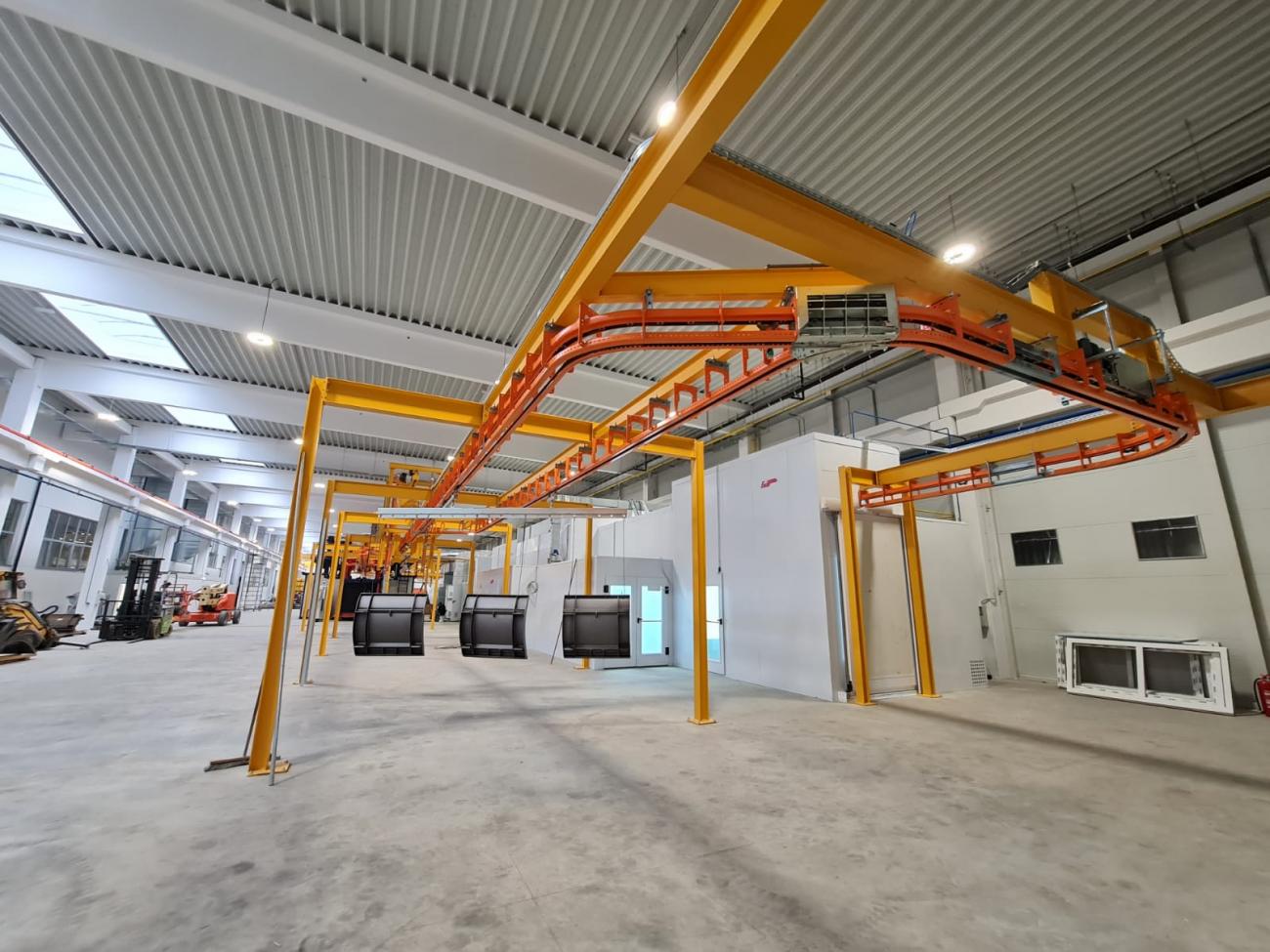The system consists of 130m of track, 2 drop sections of 500kgs each, 4m long load bars and a transfer through a shot-blasting machine.