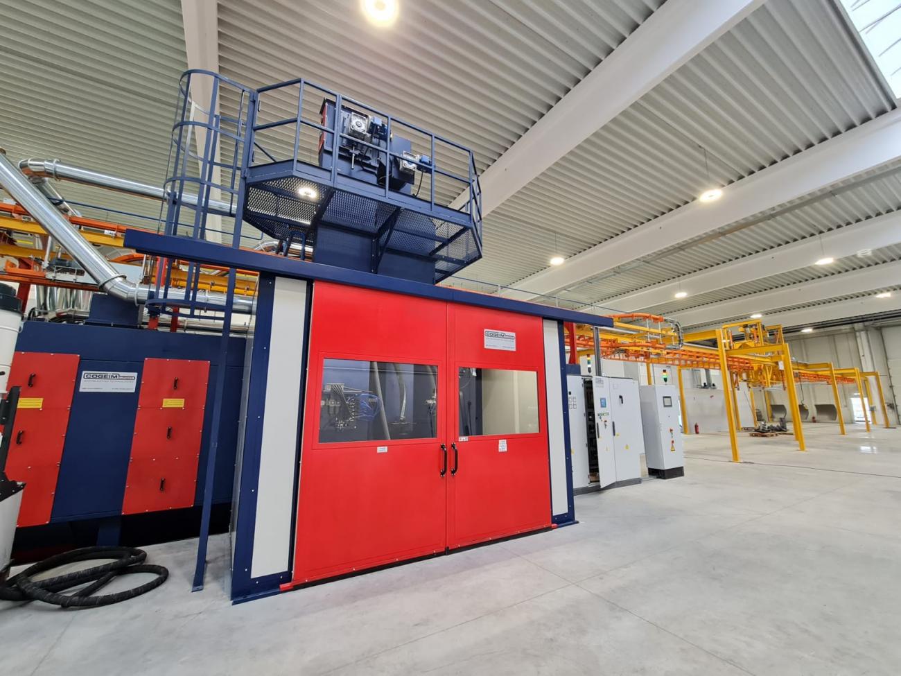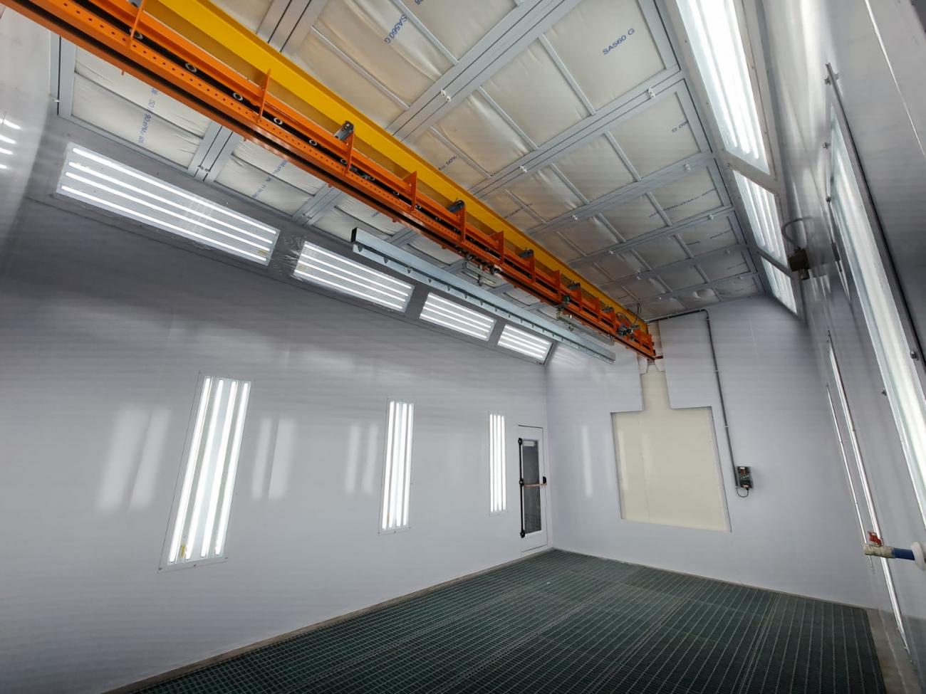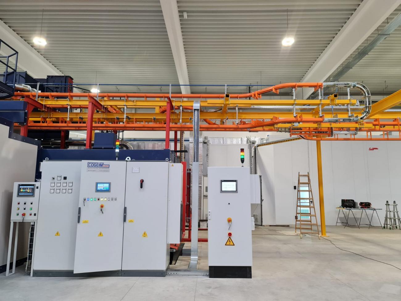 The system consists of 130m of track, 2 drop sections of 500kgs each, 4m long load bars and a transfer through a shot-blasting machine.