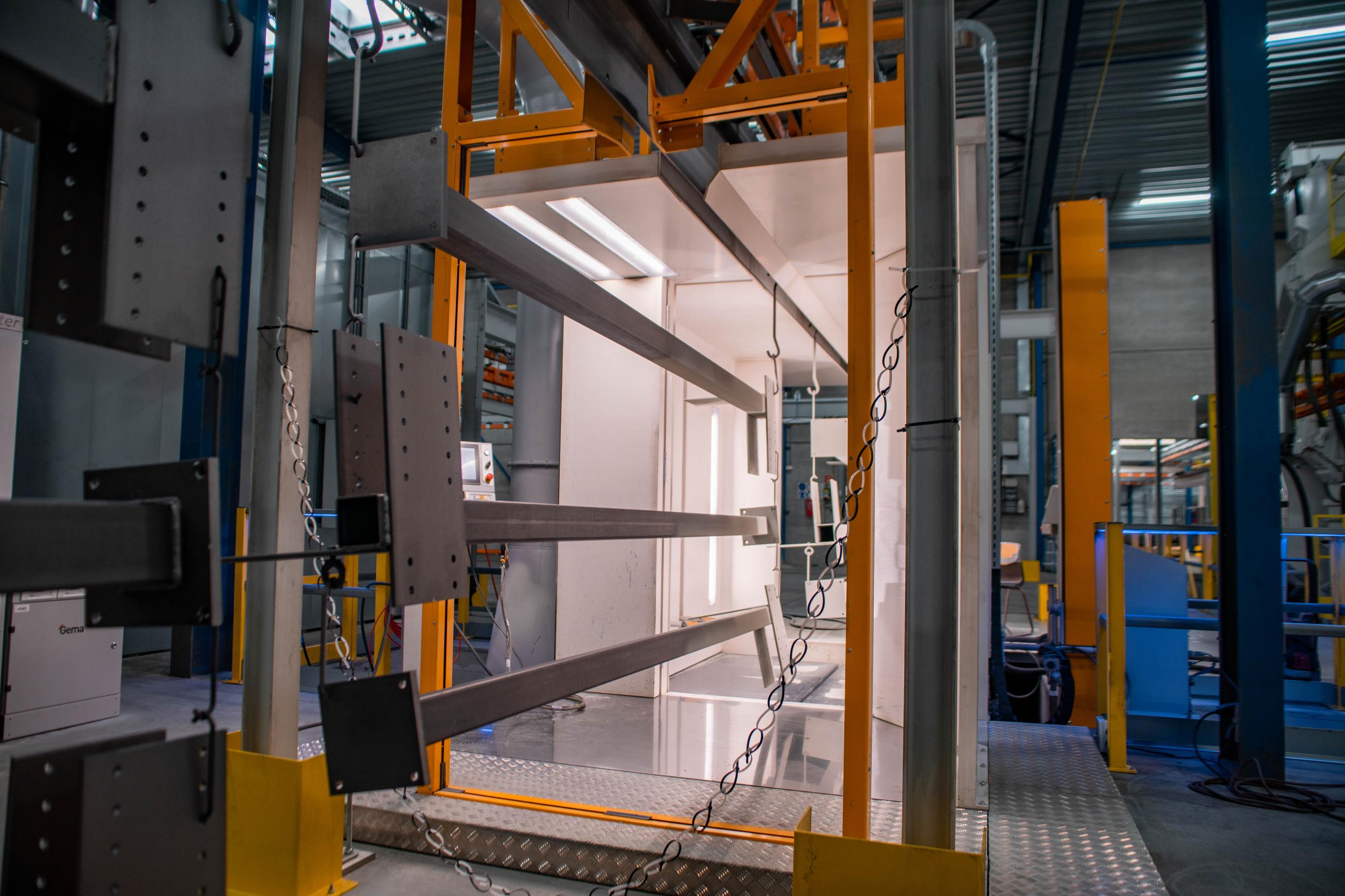 The products run through a sandblasting unit, powder coating line, and there are multiple drop-sections for loading and unloading. Each traverse measures 11m, can handle loads ups to 1250kg and be combined to heat treat products, mainly plate steel profiles, together in the oven cassette system.