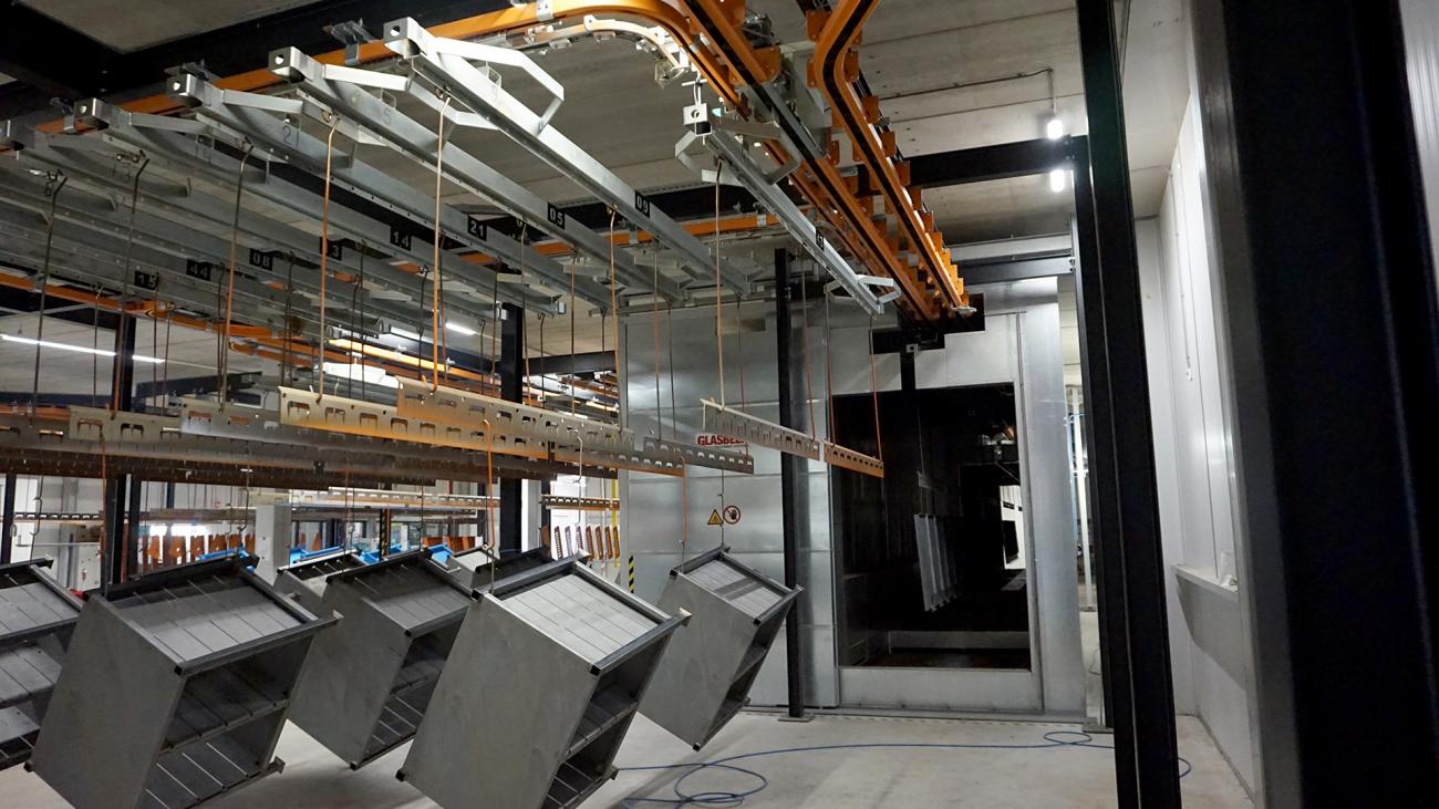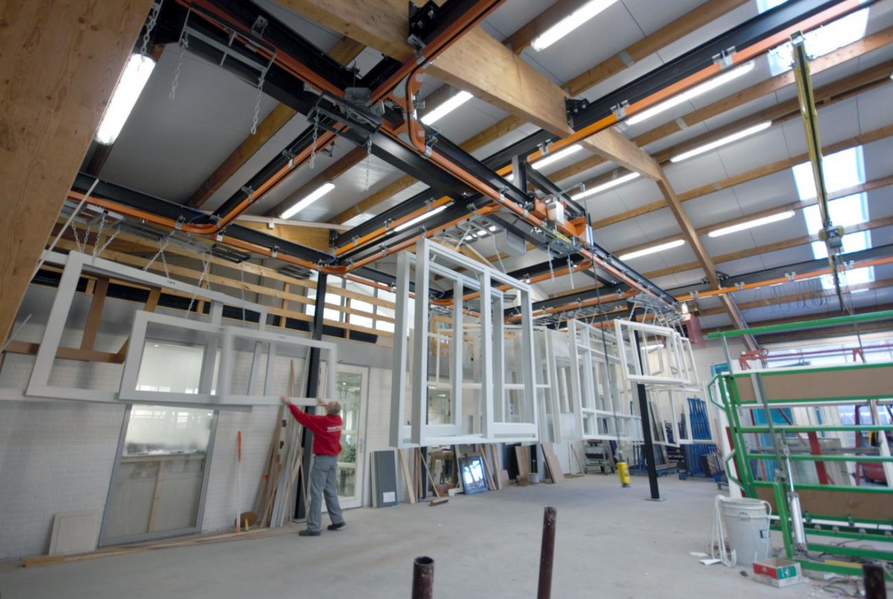 The monorail system is modular making it easy to build and expand according to the customer's wishes. Components include drop sections for ergonomic loading, a chain transfer system, automatic loading and unloading zones, bridge cranes, rotation units and more.